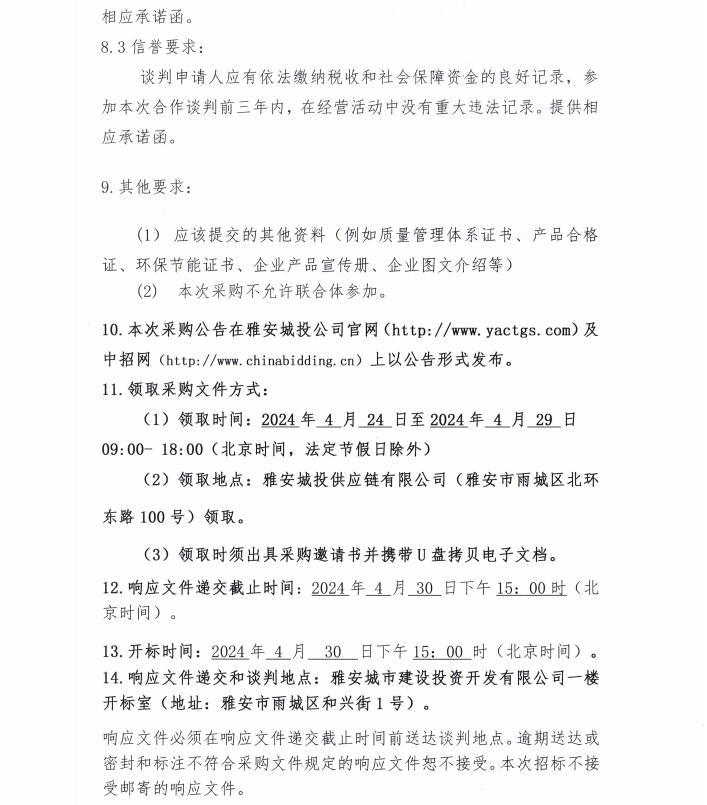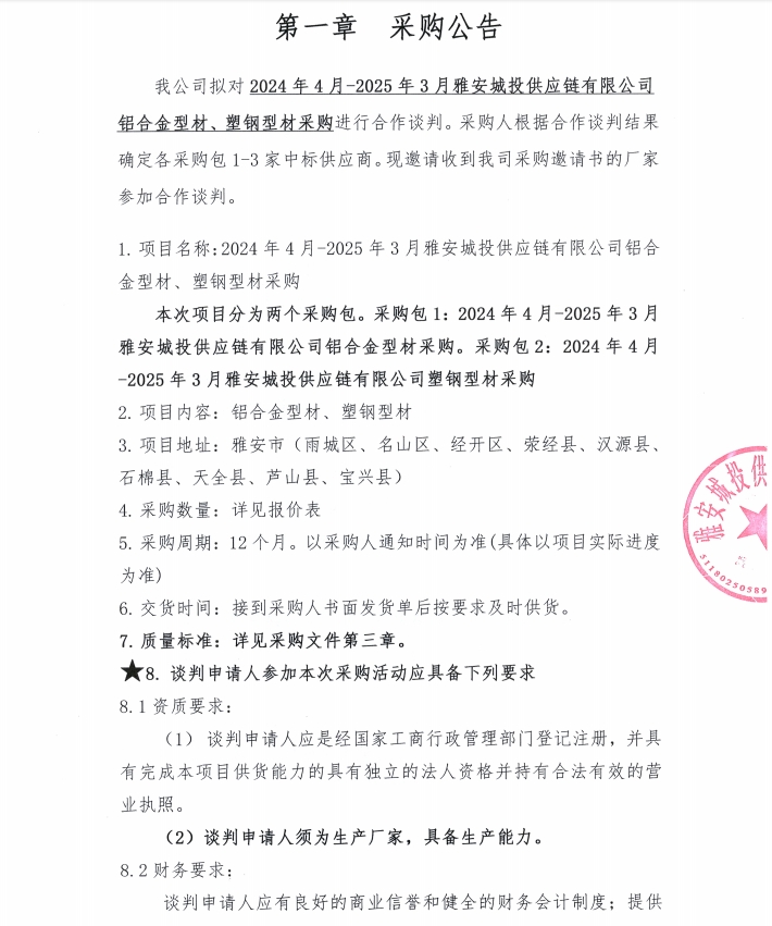 2024年4月-2025年3月雅安城投供應(yīng)鏈有限公司鋁合金型材、塑鋼型材采購公告