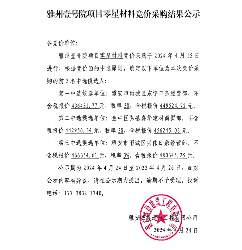 雅州壹號院項目零星材料競價采購結(jié)果公示
