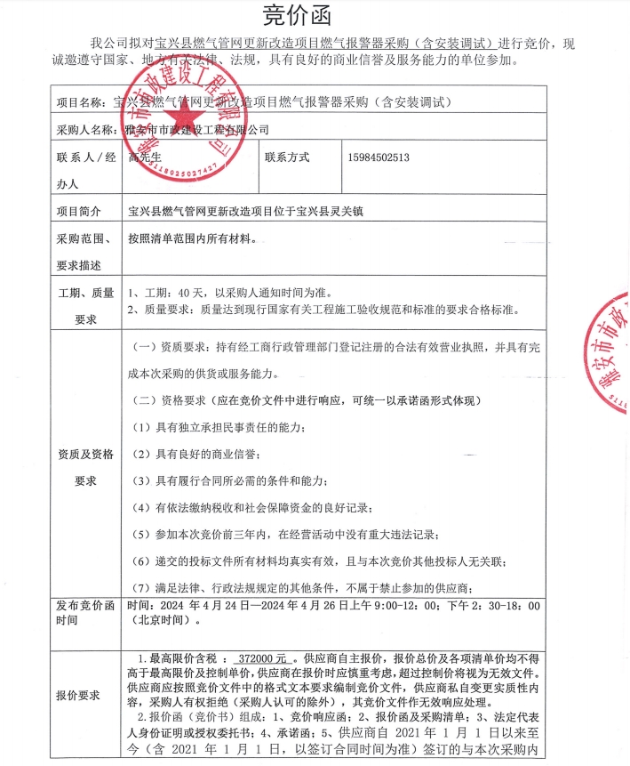 寶興縣燃?xì)夤芫W(wǎng)更新改造項(xiàng)目燃?xì)鈭?bào)警器采購(含安裝調(diào)試)競價(jià)公告