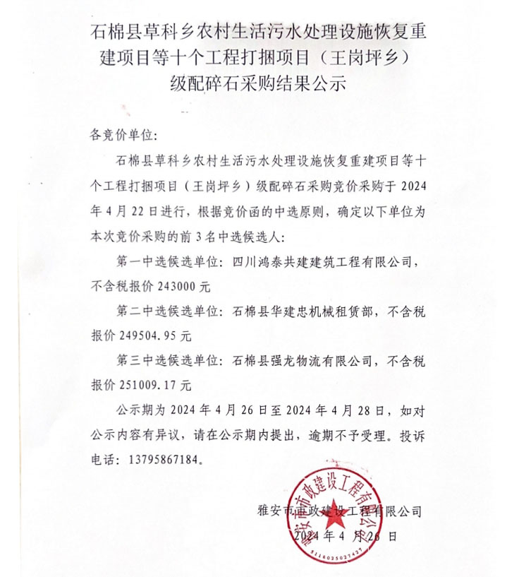 石棉縣草科鄉(xiāng)農(nóng)村生活污水處理設(shè)施恢復(fù)重建項(xiàng)目等十個(gè)工程打捆項(xiàng)目(王崗坪鄉(xiāng))級(jí)配碎石采購結(jié)果公示