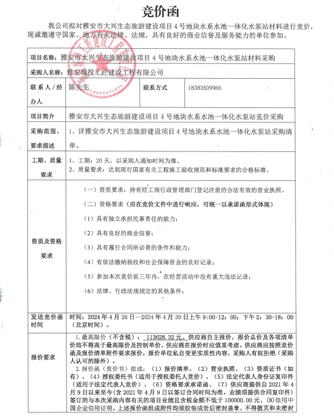 雅安市大興生態(tài)旅游建設(shè)項目4號地塊水系水池一體化水泵站材料采購競價公告