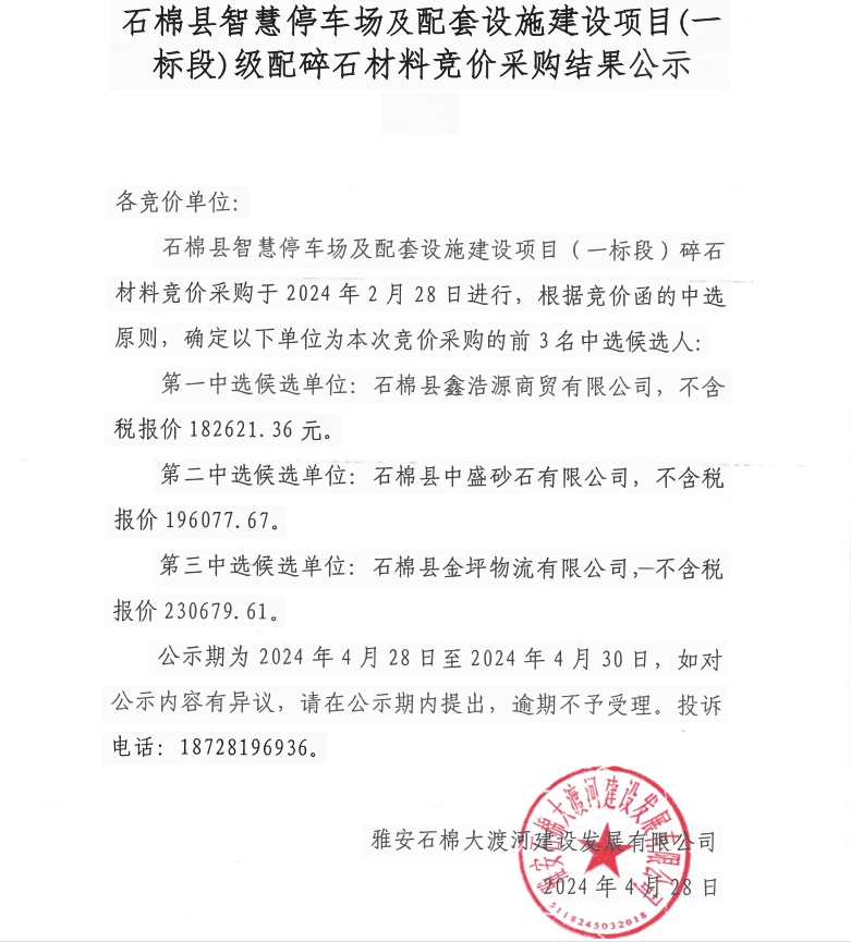 石棉縣智慧停車場(chǎng)及配套設(shè)施建設(shè)項(xiàng)目(一標(biāo)段)級(jí)配碎石材料競(jìng)價(jià)采購結(jié)果公示