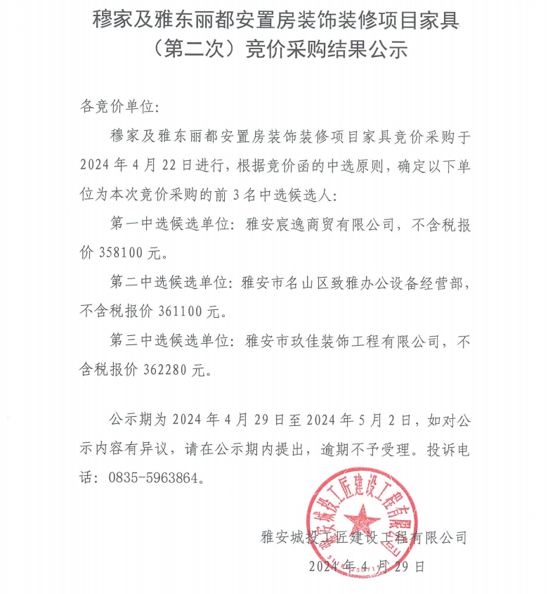 穆家及雅東麗都安置房裝飾裝修項(xiàng)目家具(第二次)競(jìng)價(jià)采購(gòu)結(jié)果公示