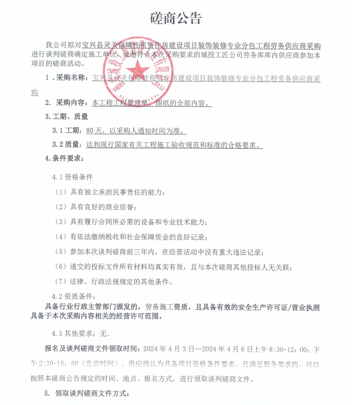 寶興縣靈關(guān)保障性租賃住房建設(shè)項目裝飾裝修專業(yè)分包工程勞務供應商采購磋商公告