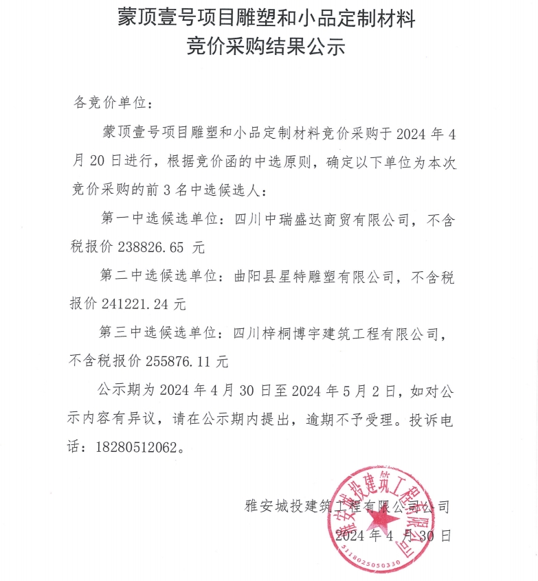 蒙頂壹號(hào)項(xiàng)目雕塑和小品定制材料競(jìng)價(jià)采購(gòu)結(jié)果公示