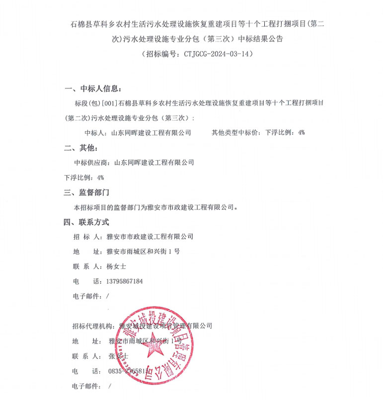 石棉縣草科鄉(xiāng)農(nóng)村生活污水處理設(shè)施恢復(fù)重建項(xiàng)目等十個(gè)工程打捆項(xiàng)目(第二次)污水處理設(shè)施專(zhuān)業(yè)分包(第三次)中標(biāo)結(jié)果公告