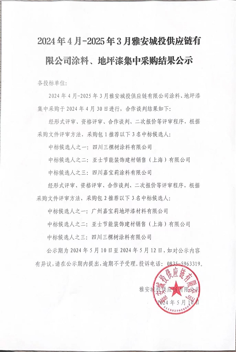 2024年4月-2025年3月雅安城投供應鏈有限公司涂料、地坪漆集中采購結果公示