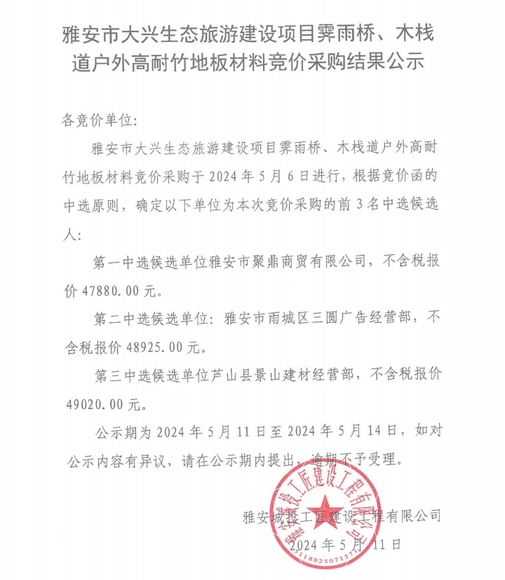 雅安市大興生態(tài)旅游建設(shè)項(xiàng)目霽雨橋、木棧道戶外高耐竹地板材料競(jìng)價(jià)采購(gòu)結(jié)果公示