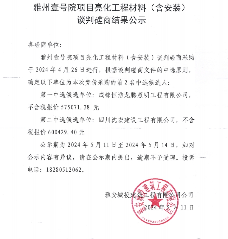 雅州壹號(hào)院項(xiàng)目亮化工程材料(含安裝)談判磋商結(jié)果公示