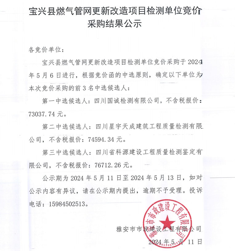 寶興縣燃?xì)夤芫W(wǎng)更新改造項(xiàng)目檢測(cè)單位競(jìng)采購(gòu)結(jié)果公示