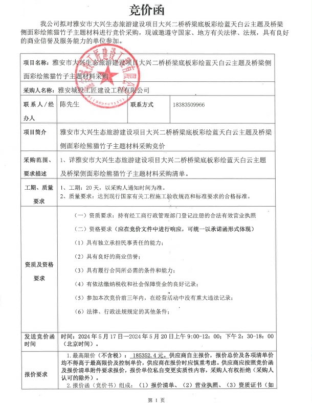 雅安市大興生態(tài)旅游建設(shè)項(xiàng)目大興二橋橋梁底板彩繪藍(lán)天白云主題及橋梁側(cè)面彩繪熊貓竹子主題材料采購競價公告