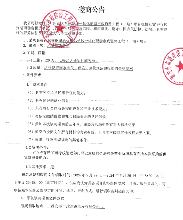 雅安樞紐站火車站站城一體化配套市政道路工程(一期)項(xiàng)目機(jī)械租賃磋商公告