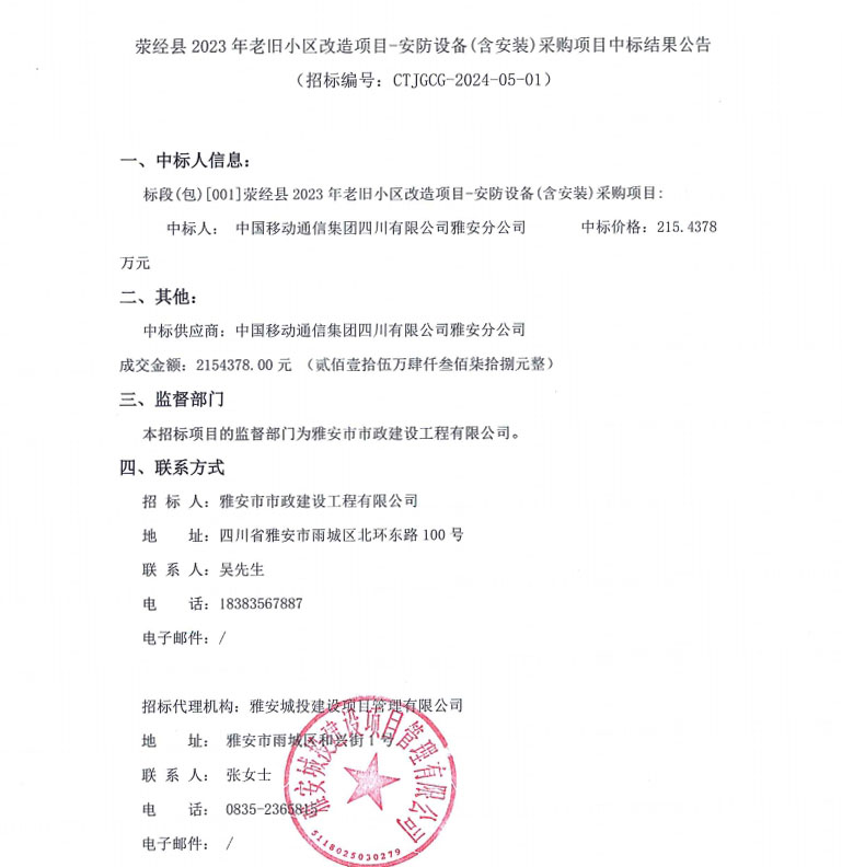 滎經(jīng)縣2023年老舊小區(qū)改造項目-安防設(shè)備(含安裝)采購項目中標(biāo)結(jié)果公告