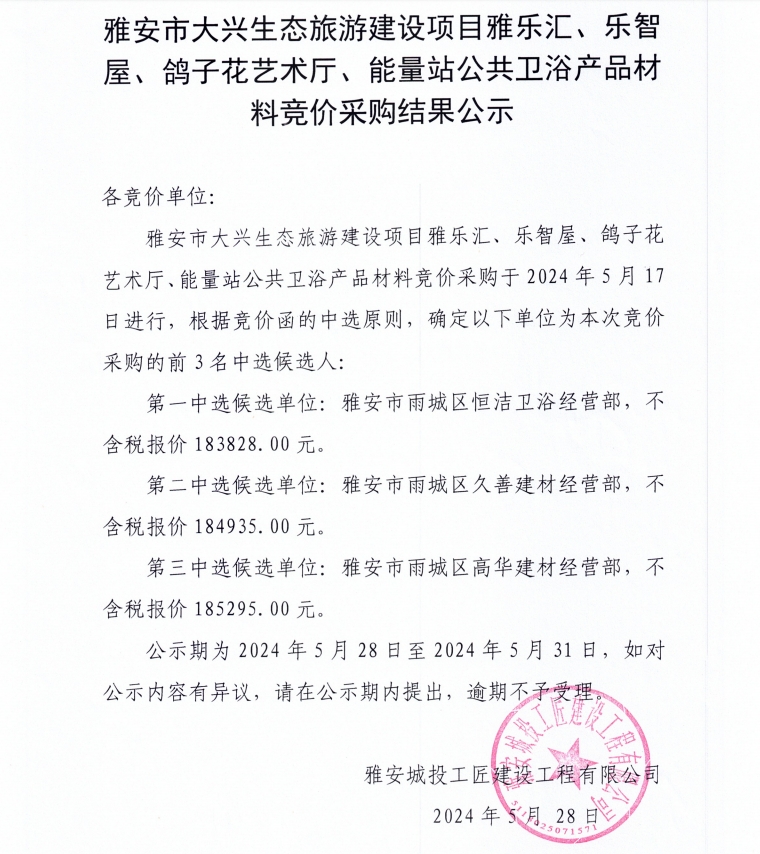 雅安市大興生態(tài)旅游建設(shè)項(xiàng)目雅樂匯、樂智屋、鴿子花藝術(shù)廳、能量站公共衛(wèi)浴材料競價(jià)采購結(jié)果公示