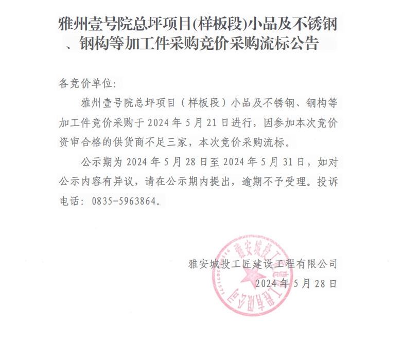 雅州壹號院總坪項(xiàng)目(樣板段)小品及不銹鋼、鋼構(gòu)等加工件采購競價采購流標(biāo)公告