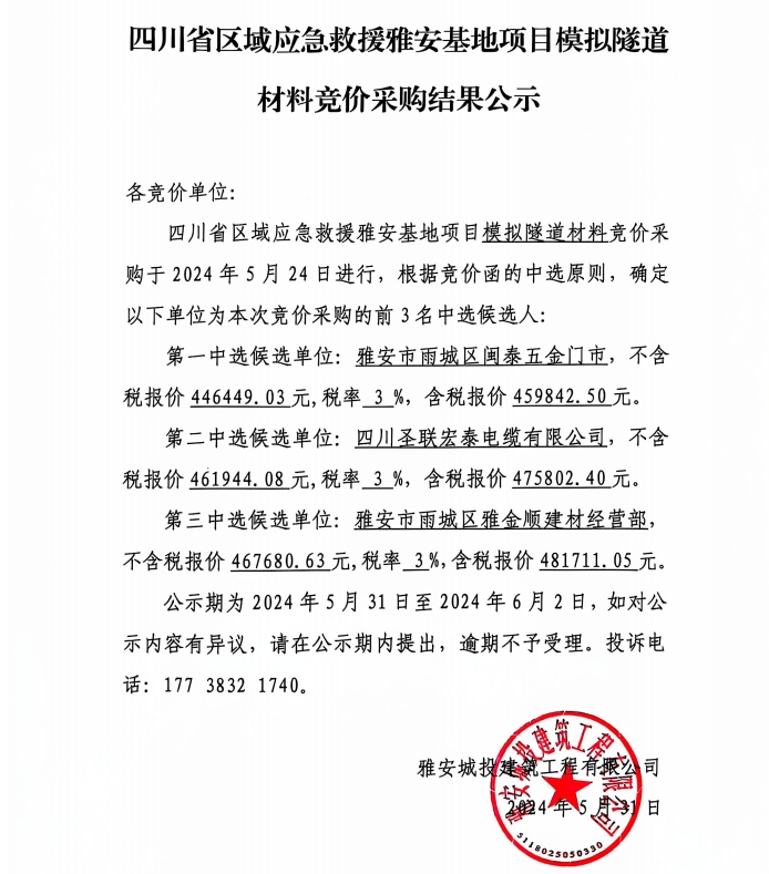 四川省區(qū)域應(yīng)急救援雅安基地項(xiàng)目模擬隧道材料競價采購結(jié)果公示