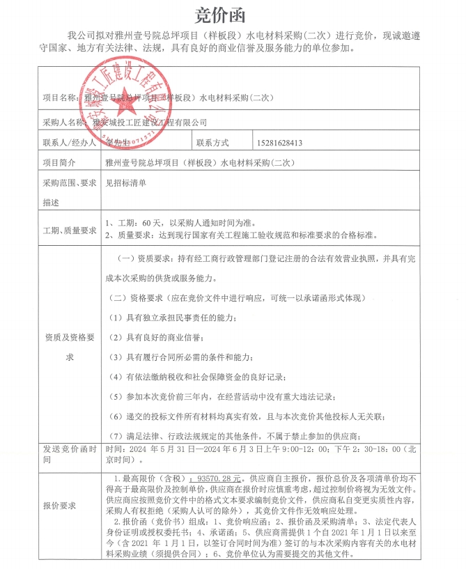 競(jìng)價(jià)函-雅州壹號(hào)院總坪項(xiàng)目(樣板段)水電材料采購(gòu)