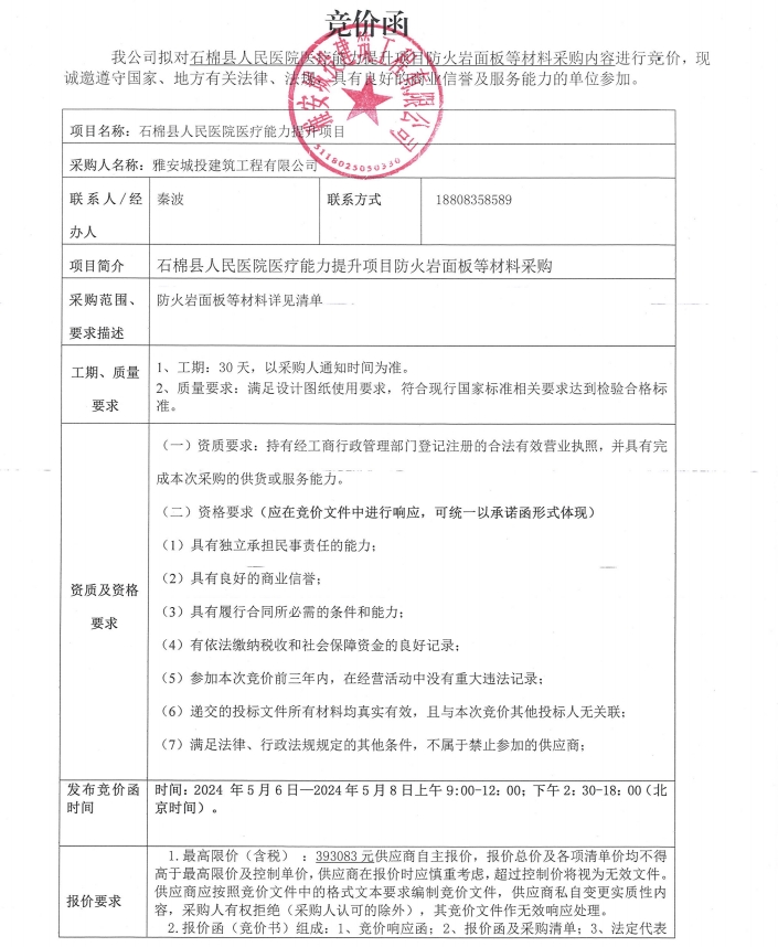 石棉縣人民醫(yī)院醫(yī)療能力提升項(xiàng)目防火巖面板等材料采購(gòu)內(nèi)容競(jìng)價(jià)公告