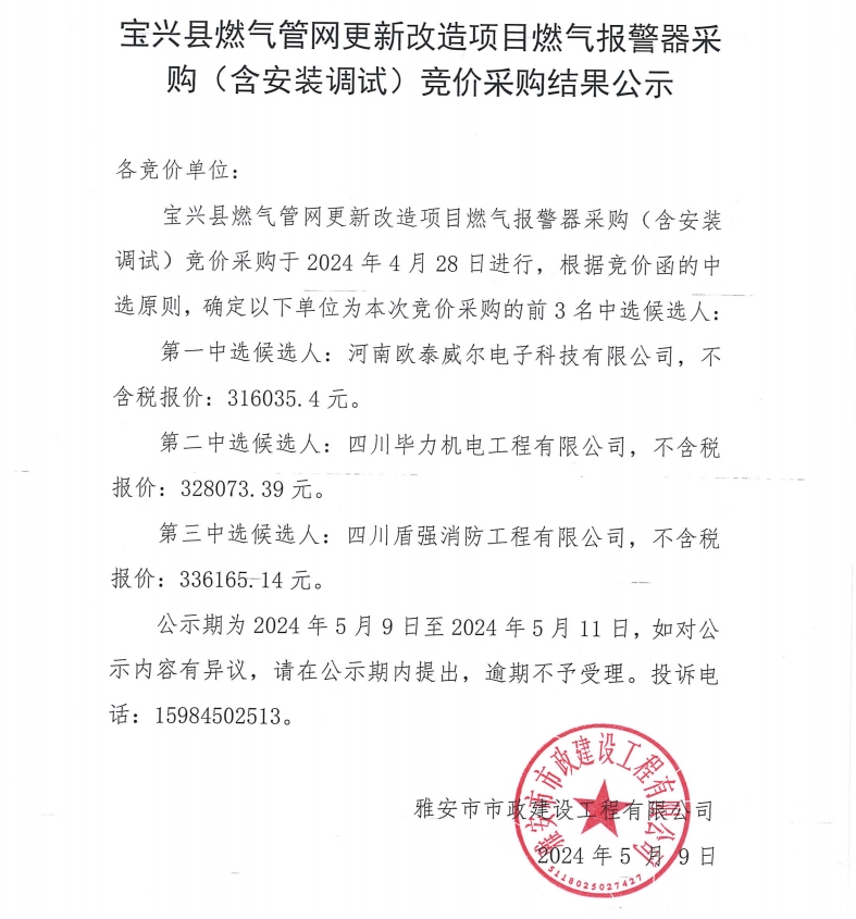 寶興縣燃?xì)夤芫W(wǎng)更新改造項(xiàng)目燃?xì)鈭?bào)警器采購(gòu)(含安裝調(diào)試)競(jìng)價(jià)采購(gòu)結(jié)果公示