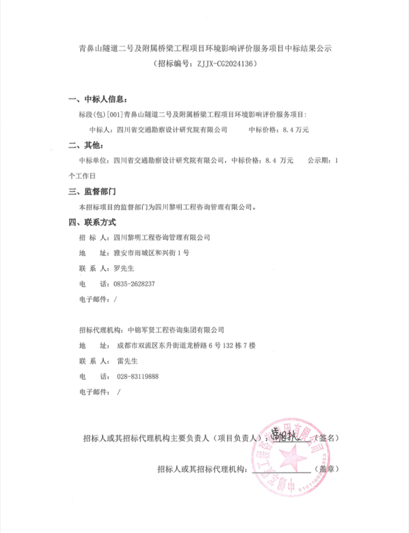青鼻山隧道二號(hào)及附屬橋梁工程項(xiàng)目環(huán)境影響評(píng)價(jià)服務(wù)項(xiàng)目中標(biāo)結(jié)果公示
