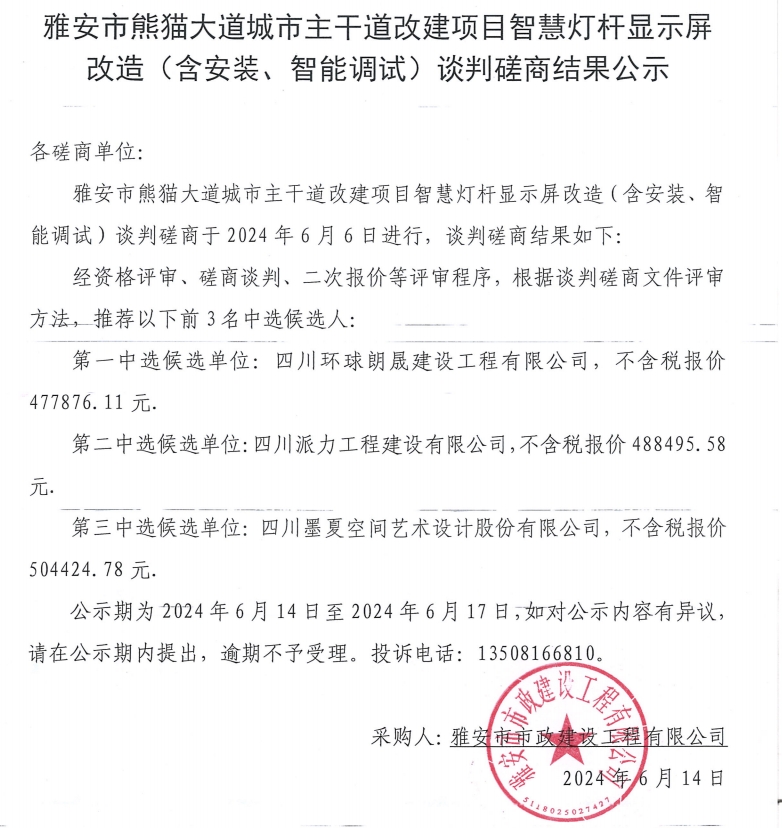 雅安市熊貓大道城市主干道改建項(xiàng)目智慧燈桿顯示屏改造(含安裝、智能調(diào)試)談判磋商結(jié)果公示