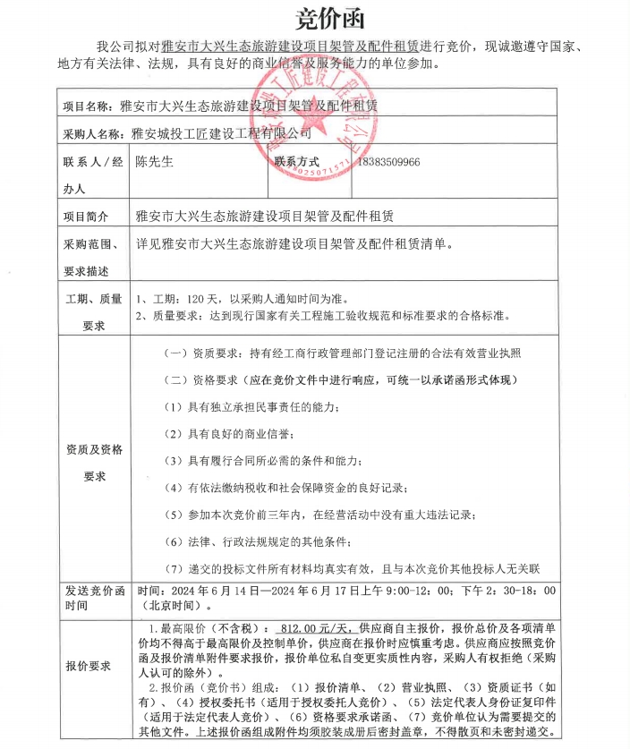 雅安市大興生態(tài)旅游建設(shè)項(xiàng)目架管及配件租賃競價(jià)公告