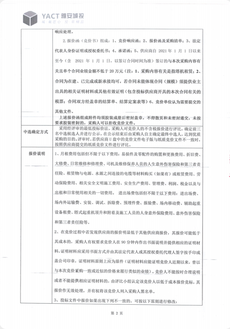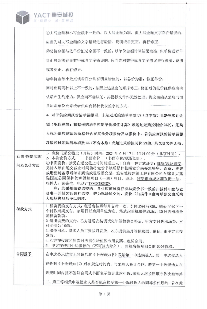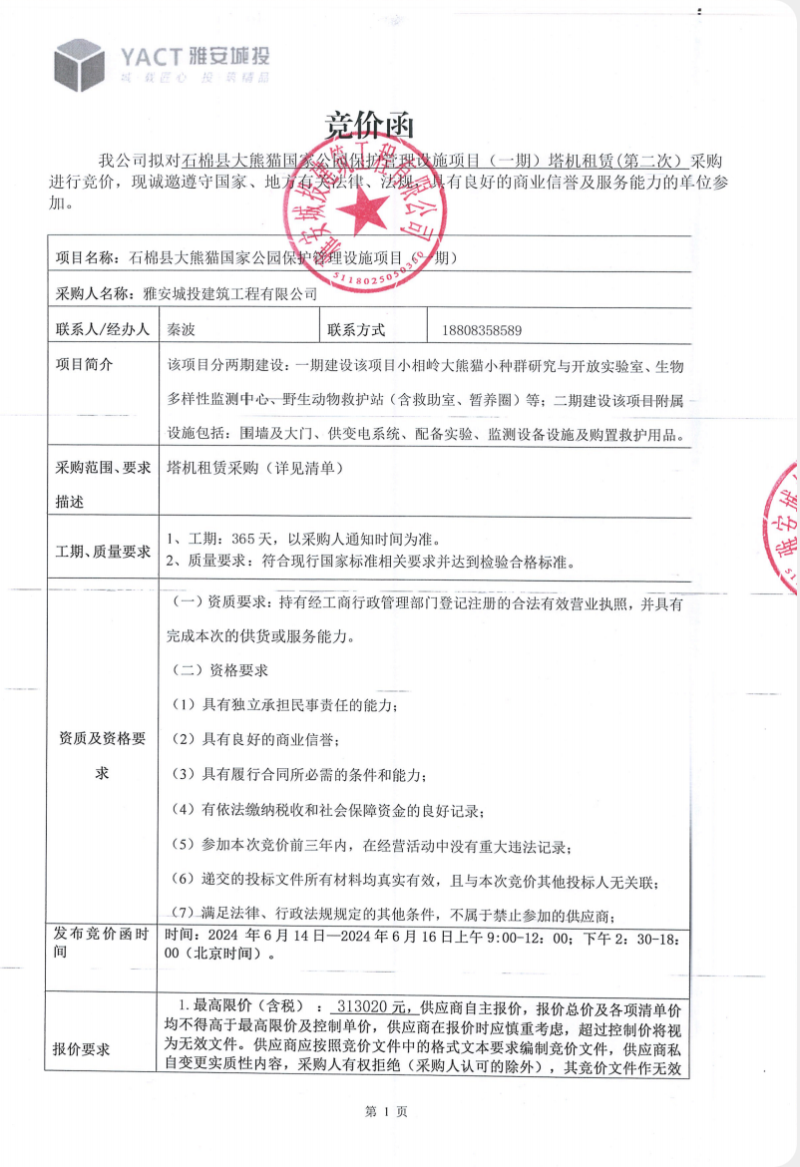 石棉縣大熊貓國家公園保護管理設施項目(一期)塔機租賃(第二次)競價公告