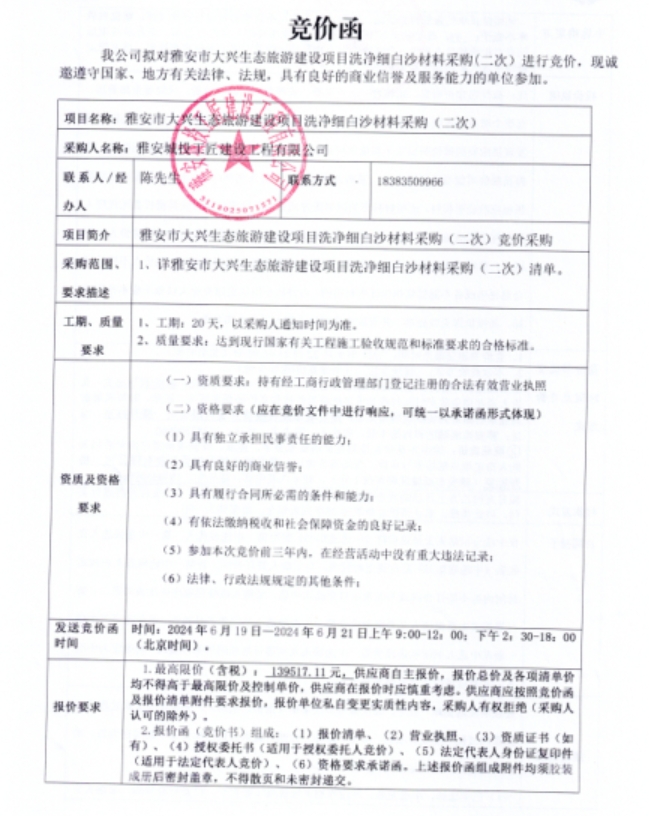 雅安市大興生態(tài)旅游建設(shè)項目洗凈細白沙材料采購(二次)競價公告