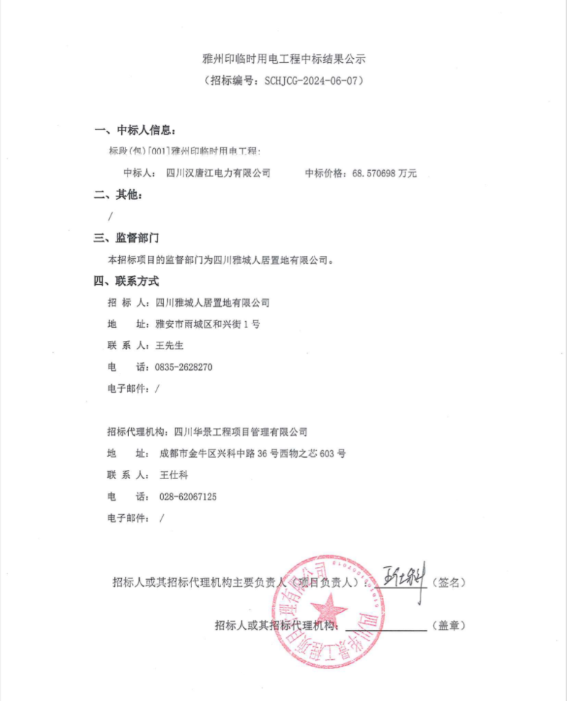 雅州印臨時(shí)用電工程中標(biāo)結(jié)果公示