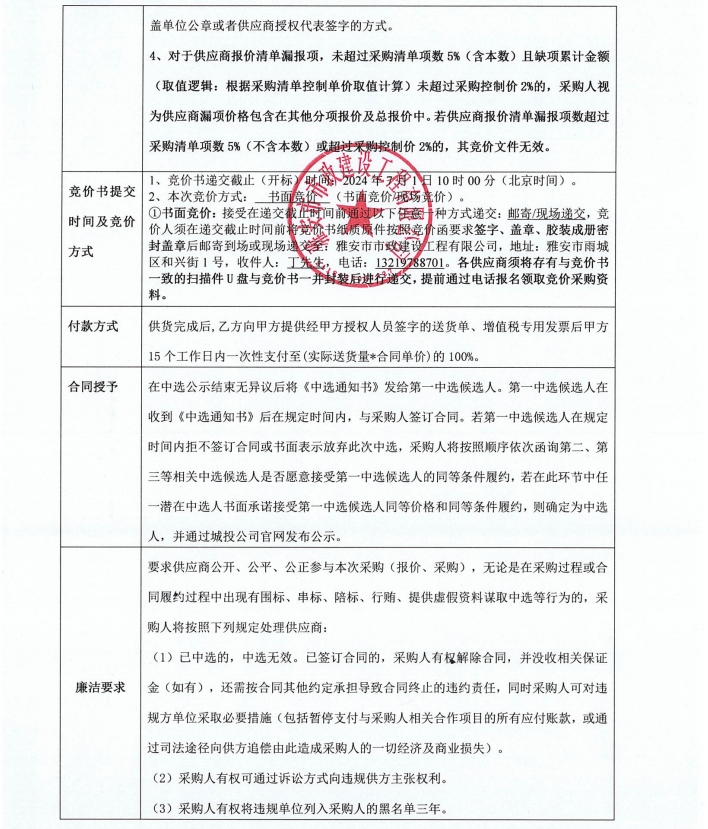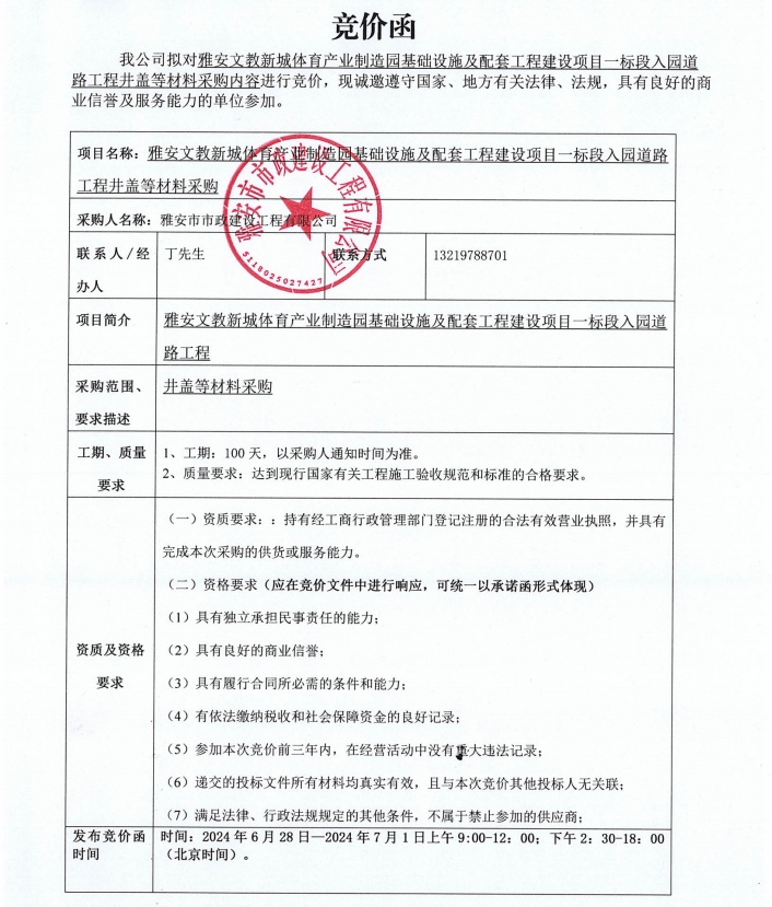 雅安文教新城體育產業(yè)制造園基礎設施及配套工程建設項目一標段入園道路工程項目井蓋等材料采購競價公告