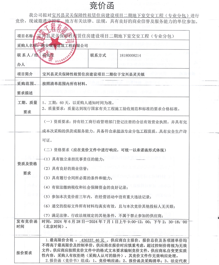 寶興縣靈關(guān)保障性租賃住房建設(shè)項(xiàng)目二期地下室交安工程(專業(yè)分包)競(jìng)價(jià)公告