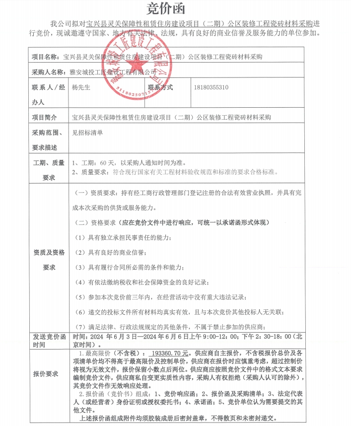 寶興縣靈關保障性租賃住房建設項目(二期)公區(qū)裝修工程瓷磚材料采購競價公告