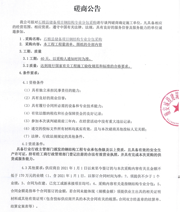 石棉縣儲(chǔ)備項(xiàng)目鋼結(jié)構(gòu)專(zhuān)業(yè)分包采購(gòu)談判磋商公告