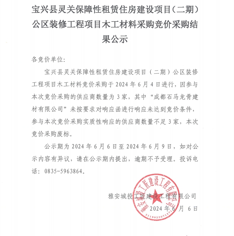 寶興縣靈關(guān)保障性租賃住房建設(shè)項目(二期)公區(qū)裝修工程項目木工材料采購競價采購結(jié)果公示