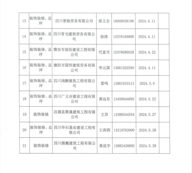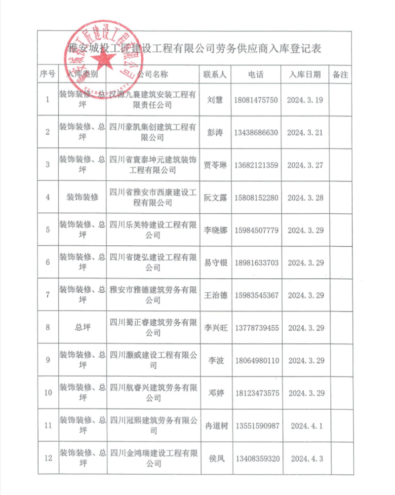 雅安城投工匠建設(shè)工程有限公司勞務(wù)供應(yīng)商入庫(kù)登記表