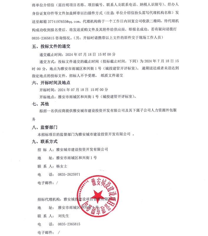 雅安城市建設投資開發(fā)有限公司及其下屬子公司人力資源外包服務項目公告