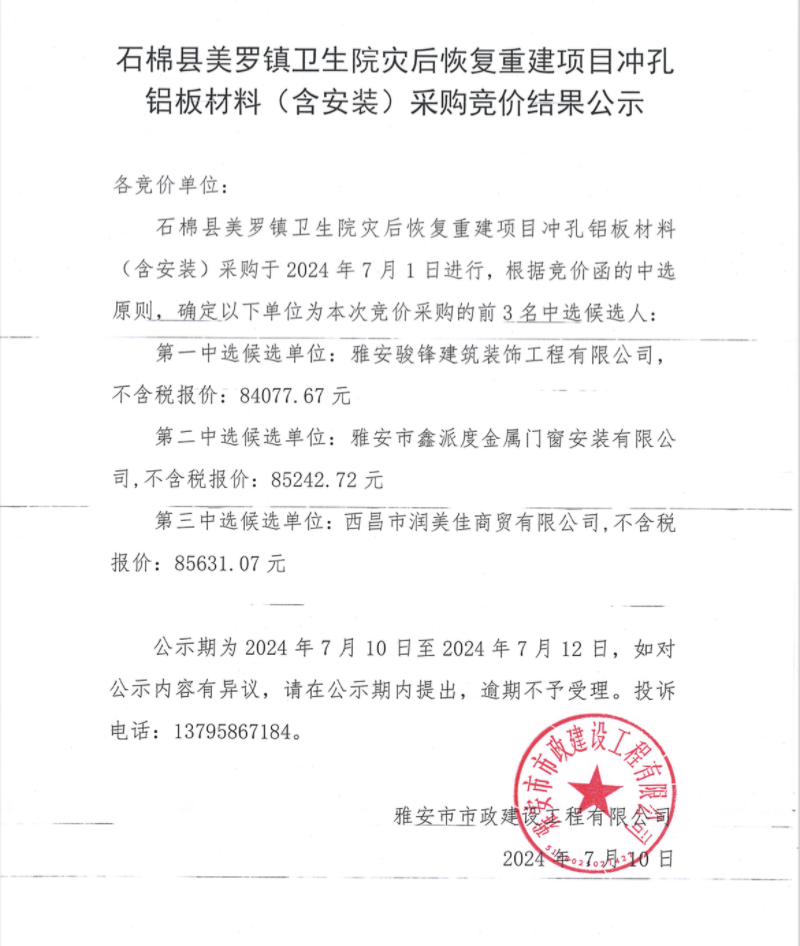 石棉美羅鎮(zhèn)衛(wèi)生院災(zāi)后恢復(fù)重建項目沖孔鋁板材料(含安裝)采購競價結(jié)果公示