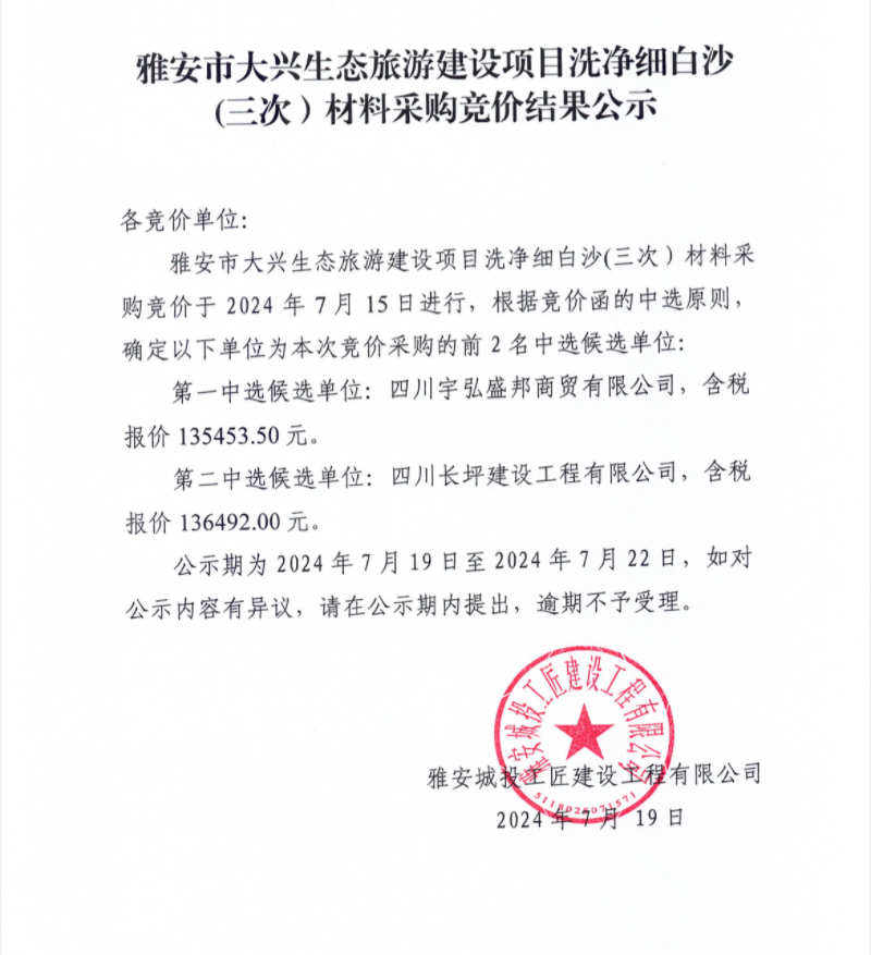 雅安市大興生態(tài)旅游建設(shè)項(xiàng)目洗凈細(xì)白沙(三次)材料采購競(jìng)價(jià)結(jié)果公示