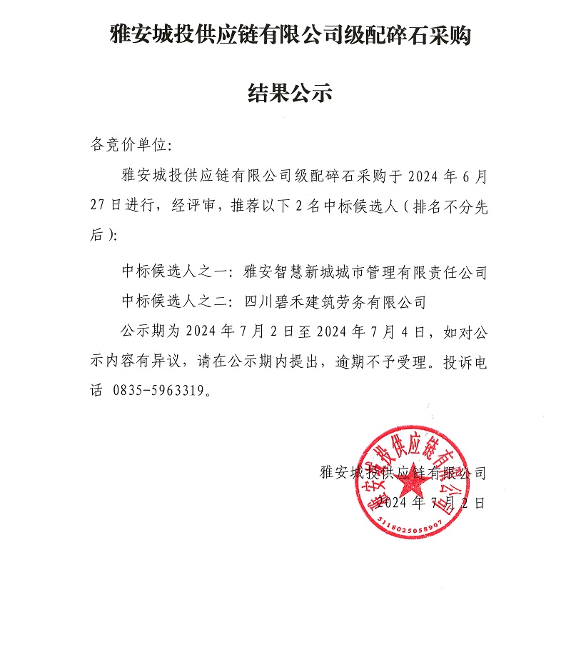 雅安城投供應(yīng)鏈有限公司級(jí)配碎石采購(gòu)結(jié)果公示