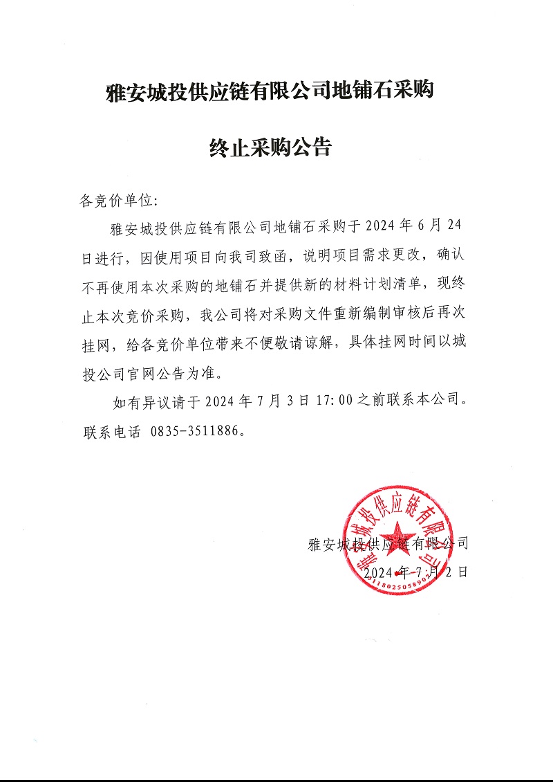 雅安城投供應鏈有限公司地鋪石采購終止采購公告