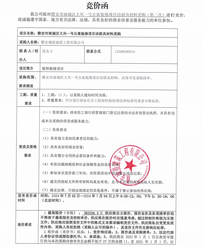 雅安市雨城區(qū)大興一號(hào)公寓裝修項(xiàng)目潔廚具材料采購(gòu)(第二次)競(jìng)價(jià)公告