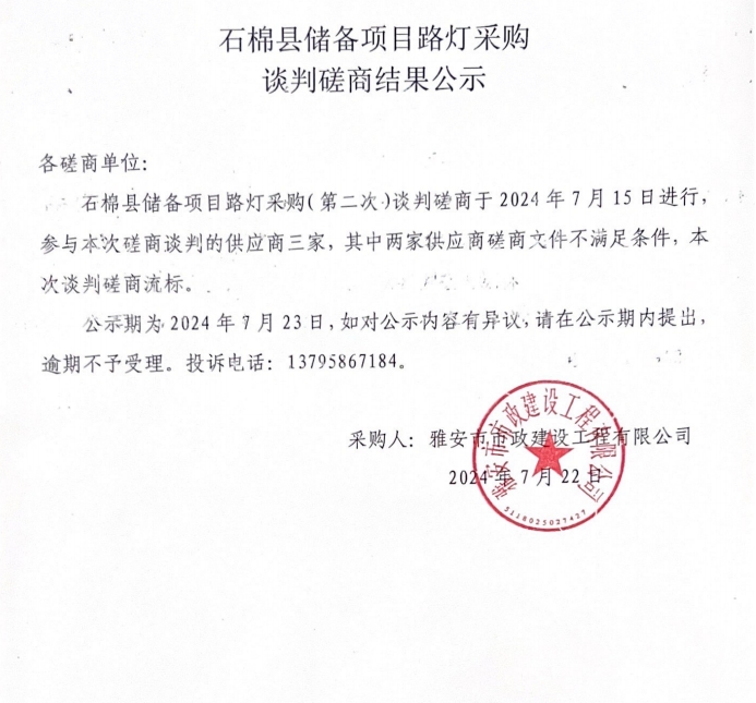 石棉縣儲(chǔ)備項(xiàng)目路燈采購談判磋商結(jié)果公示
