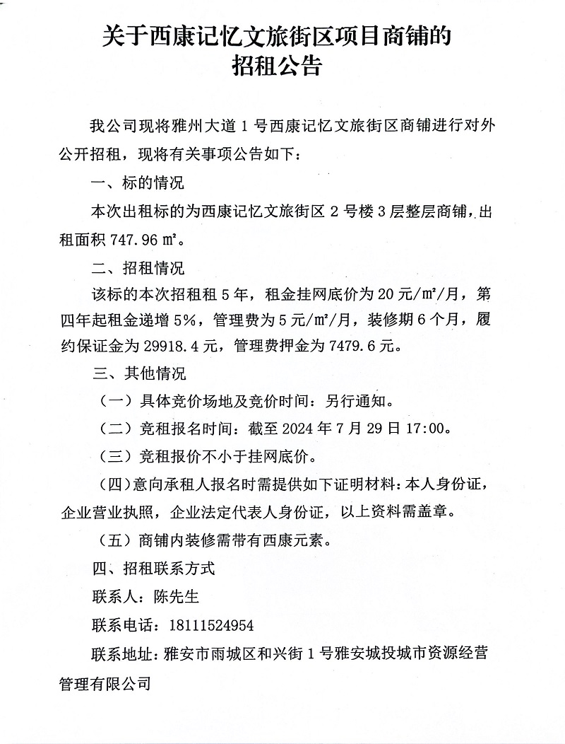 關于西康記憶文旅街區(qū)項目商鋪的招租公告