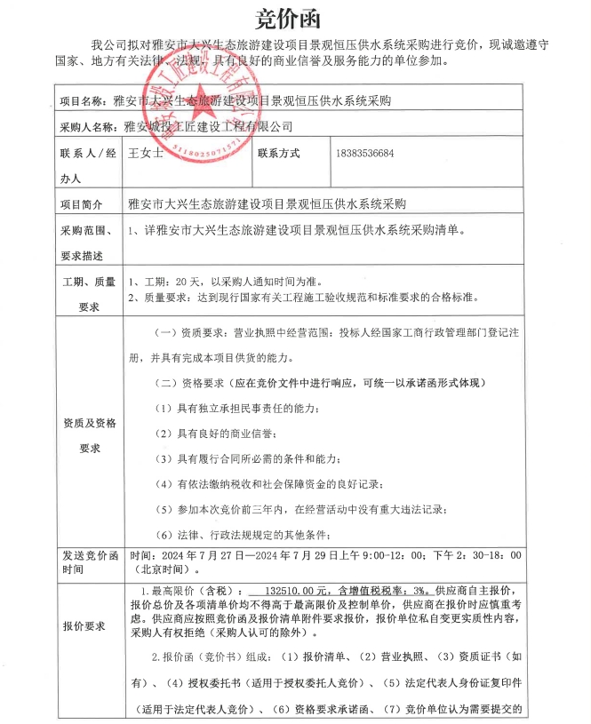 雅安市大興生態(tài)旅游建設(shè)項(xiàng)目景觀恒壓供水系統(tǒng)采購(gòu)競(jìng)價(jià)公告