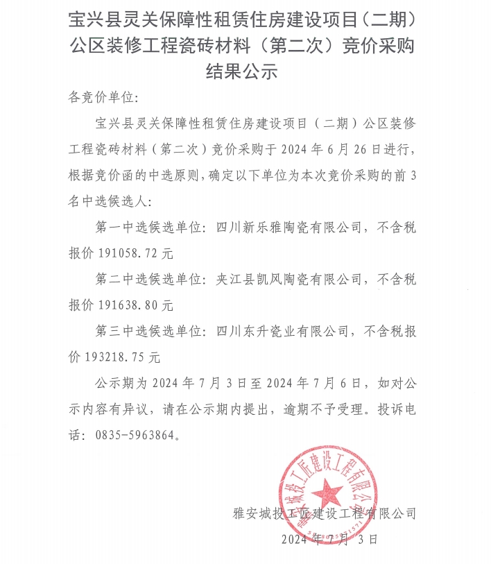 寶興縣靈關保障性租賃住房建設項目(二期)公區(qū)裝修工程瓷磚材料(第二次)競價采購結果公示)
