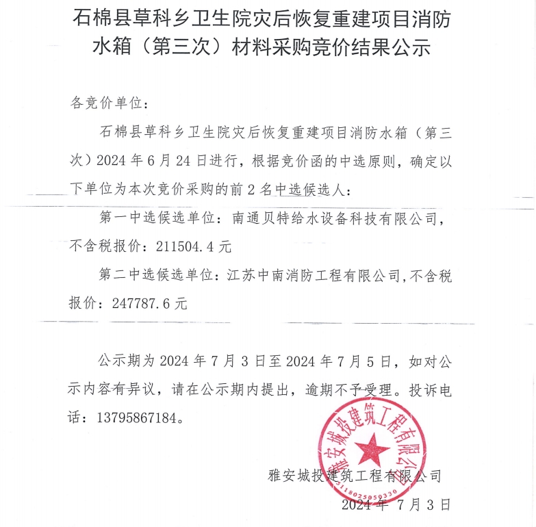 石棉縣草科鄉(xiāng)衛(wèi)生院災(zāi)后恢復(fù)重建項(xiàng)目消防水箱(第三次)材料采購競價結(jié)果公示