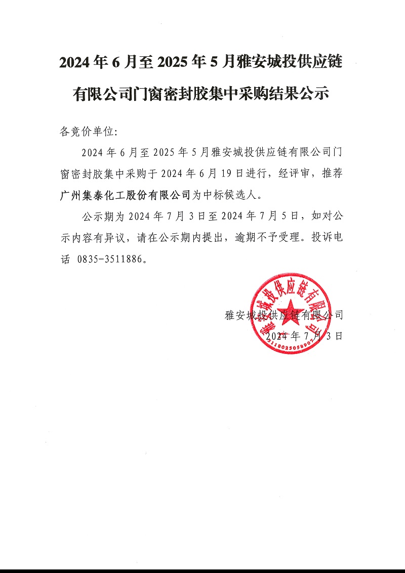 2024年6月至2025年5月雅安城投供應(yīng)鏈有限公司門(mén)窗密封膠集中采購(gòu)結(jié)果公示