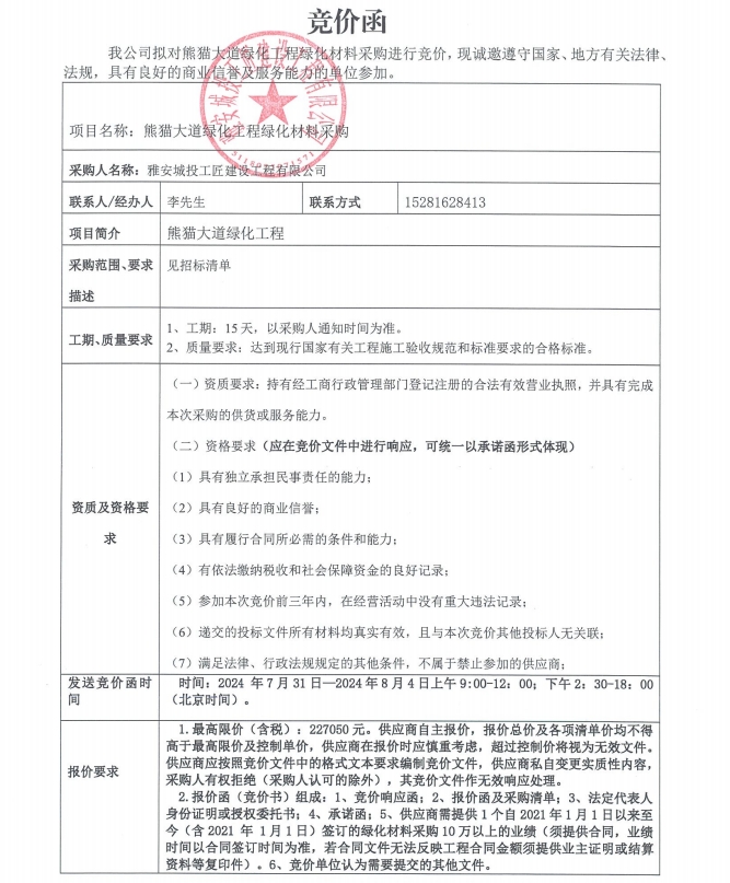 熊貓大道綠化工程綠化材料采購競(jìng)價(jià)公告
