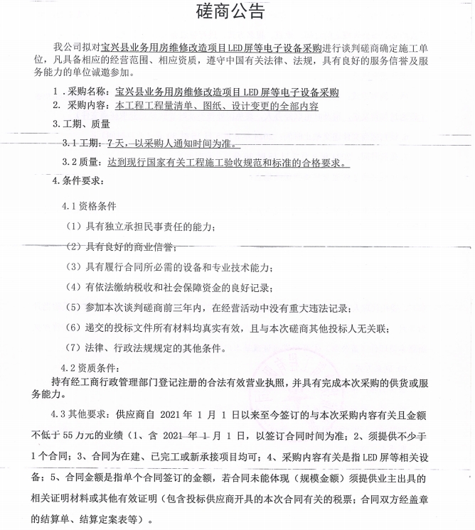 寶興縣業(yè)務(wù)用房維修改造項目LED屏等電子設(shè)備采購磋商公告