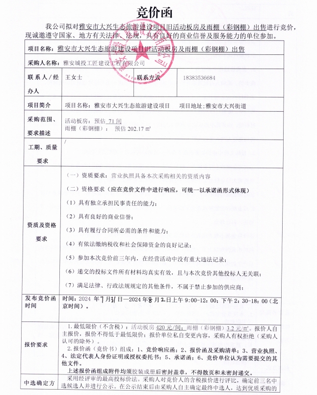 附件2:雅安市大興生態(tài)旅游建設(shè)項(xiàng)目舊活動(dòng)板房出售競(jìng)價(jià)函